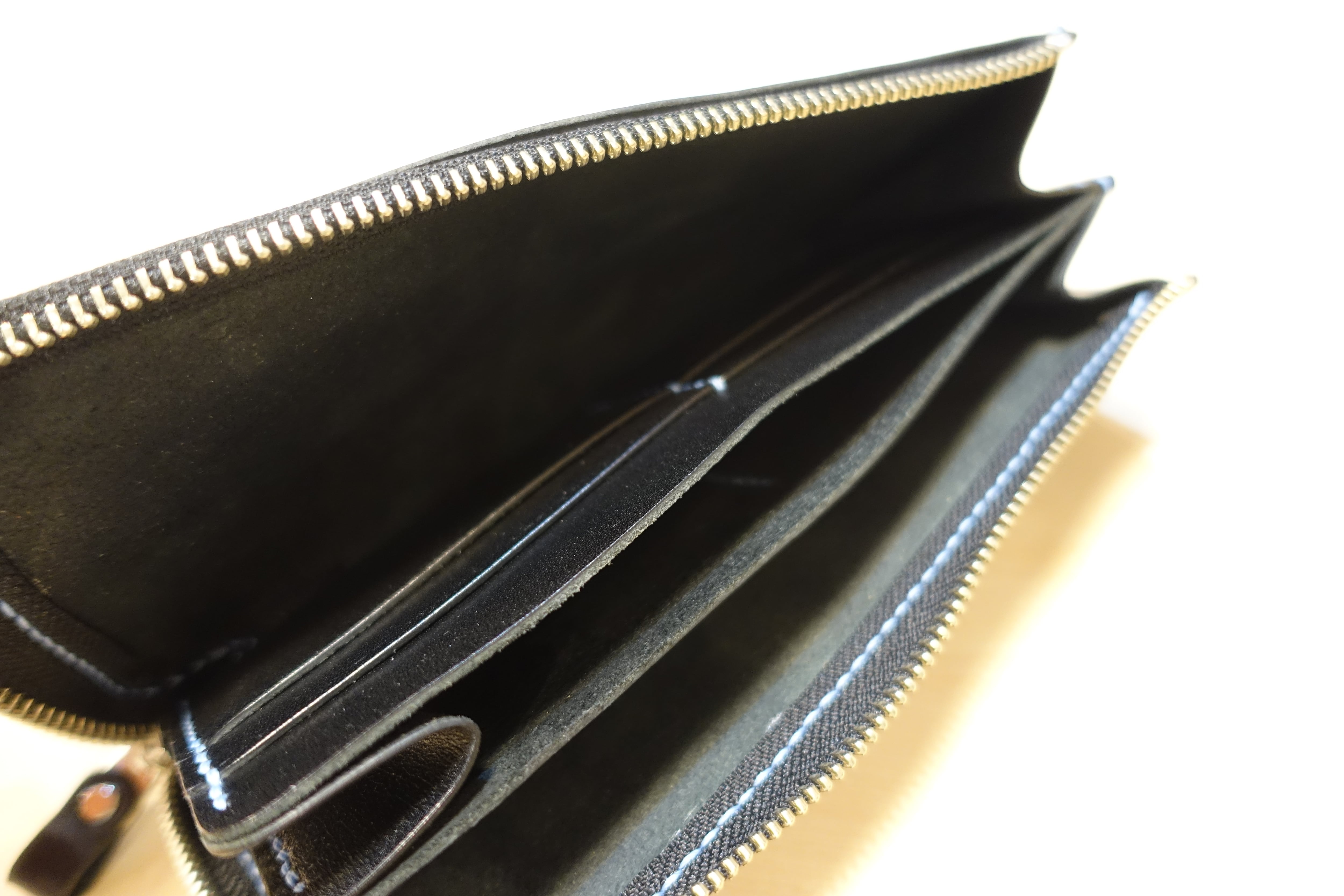 ブラックのタンニン鞣し革(栃木レザー)にブルーの糸でステッチをあしらい、手縫いで丁寧に仕上げたcublueオリジナル長財布。