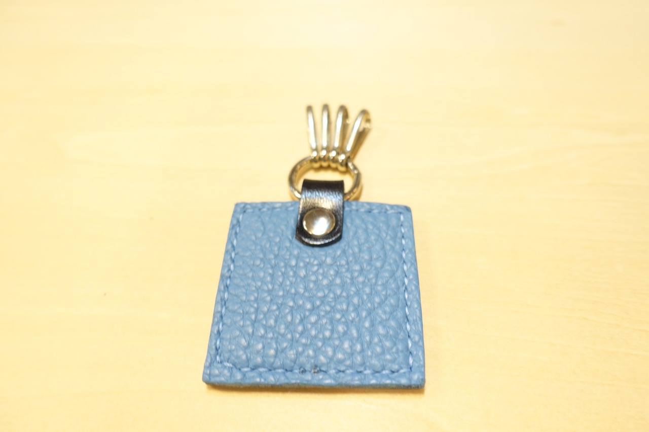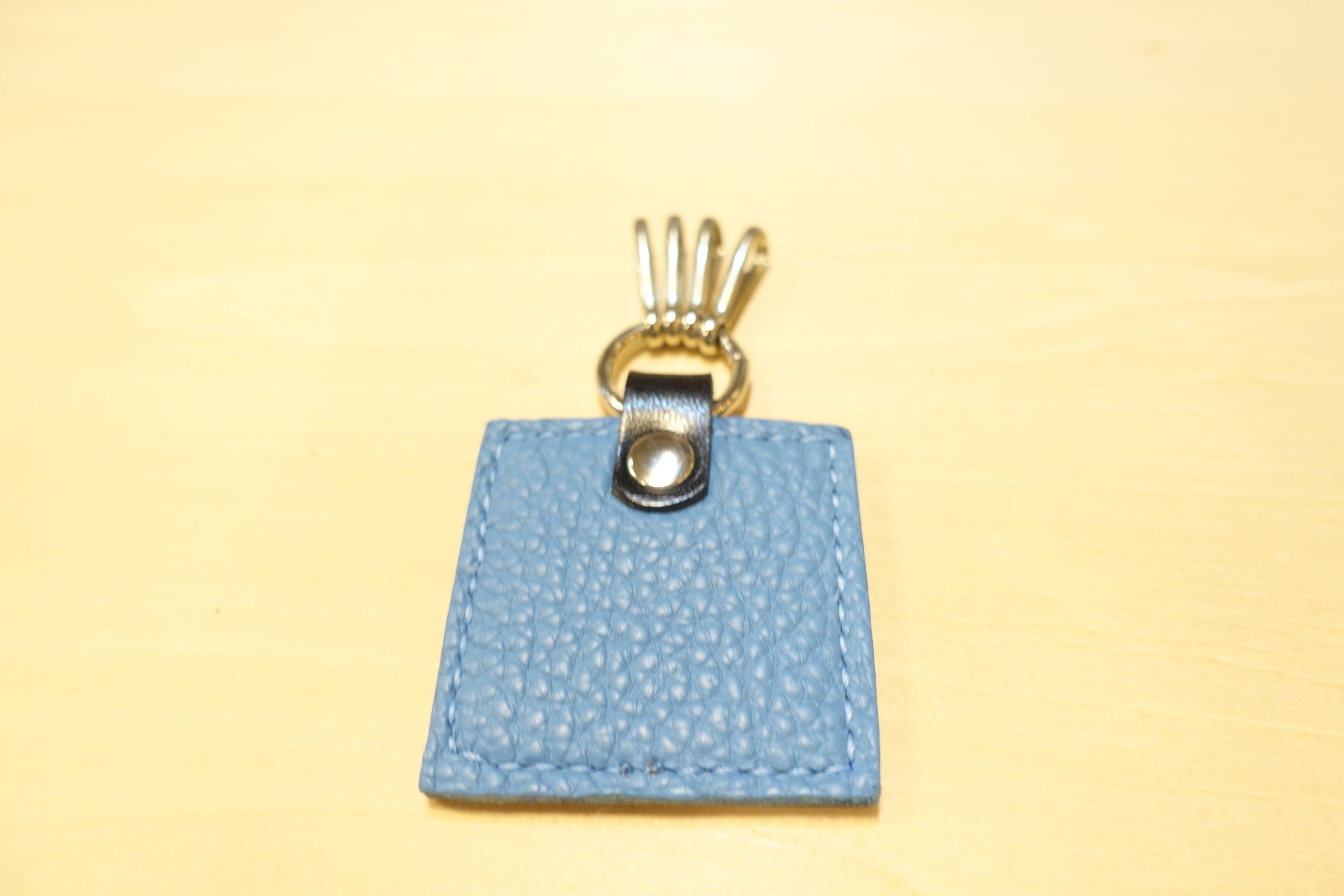 ブラックのタンニン鞣し革(栃木レザー)にブルーの糸でステッチをあしらい、手縫いで丁寧に仕上げたcublueオリジナルキーホルダー。