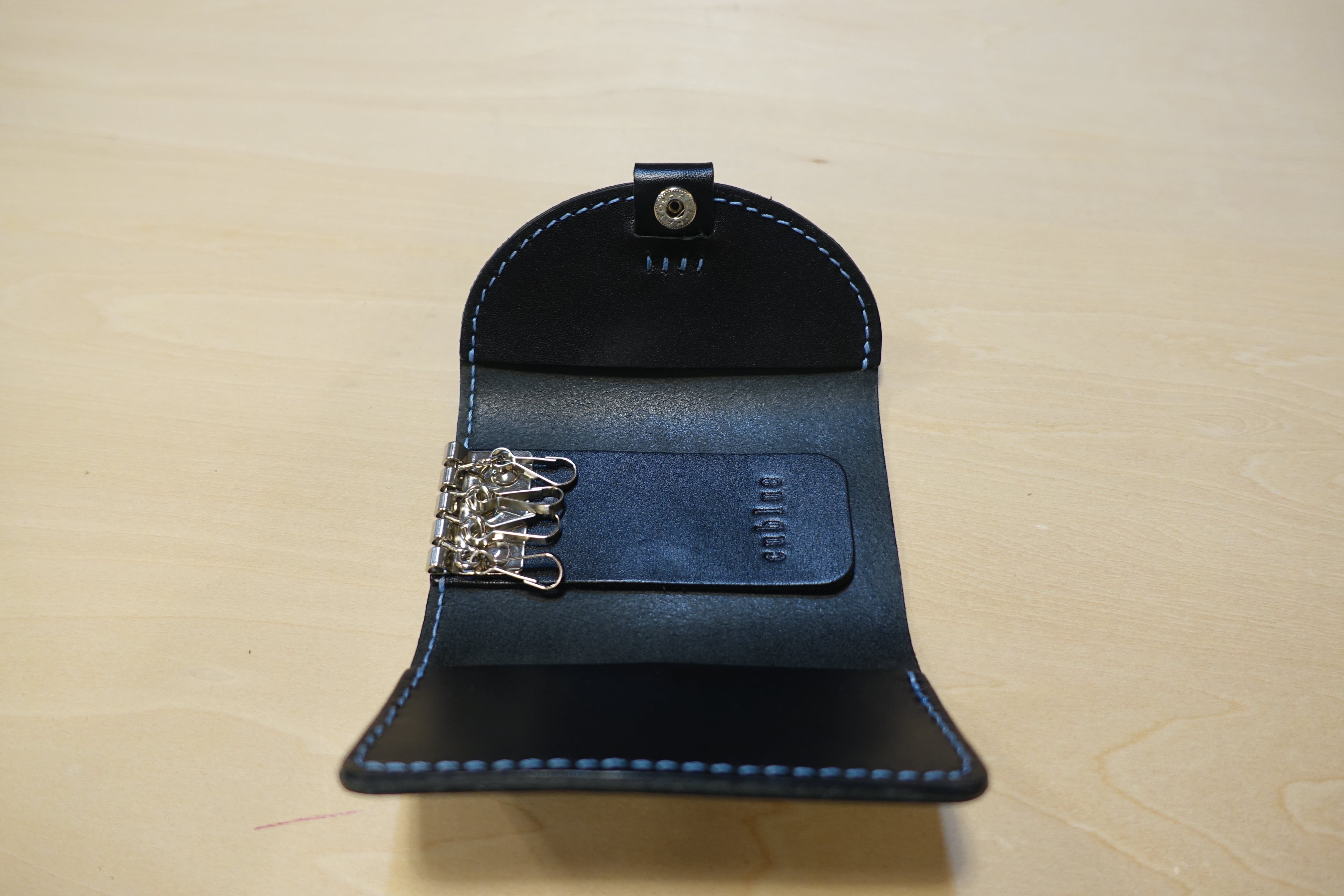 ブラックのタンニン鞣し革(栃木レザー)にブルーの糸でステッチをあしらい、手縫いで丁寧に仕上げたcublueオリジナルキーケース。